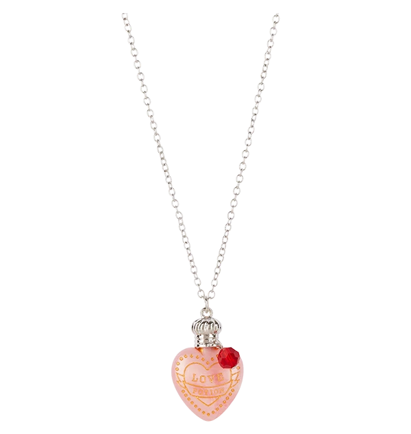 A striking iridescent pink heart with gold writing is set in contrast to a silvered clasp and chain, while a ruby red gem detail hangs from the potion’s cap. The front reads ‘Love Potion’ inside a painterly looking golden heart and banner. The adjustable chain features a Platform 9 ¾ logo charm at the end, alongside its partnering lobster claw style clasp.