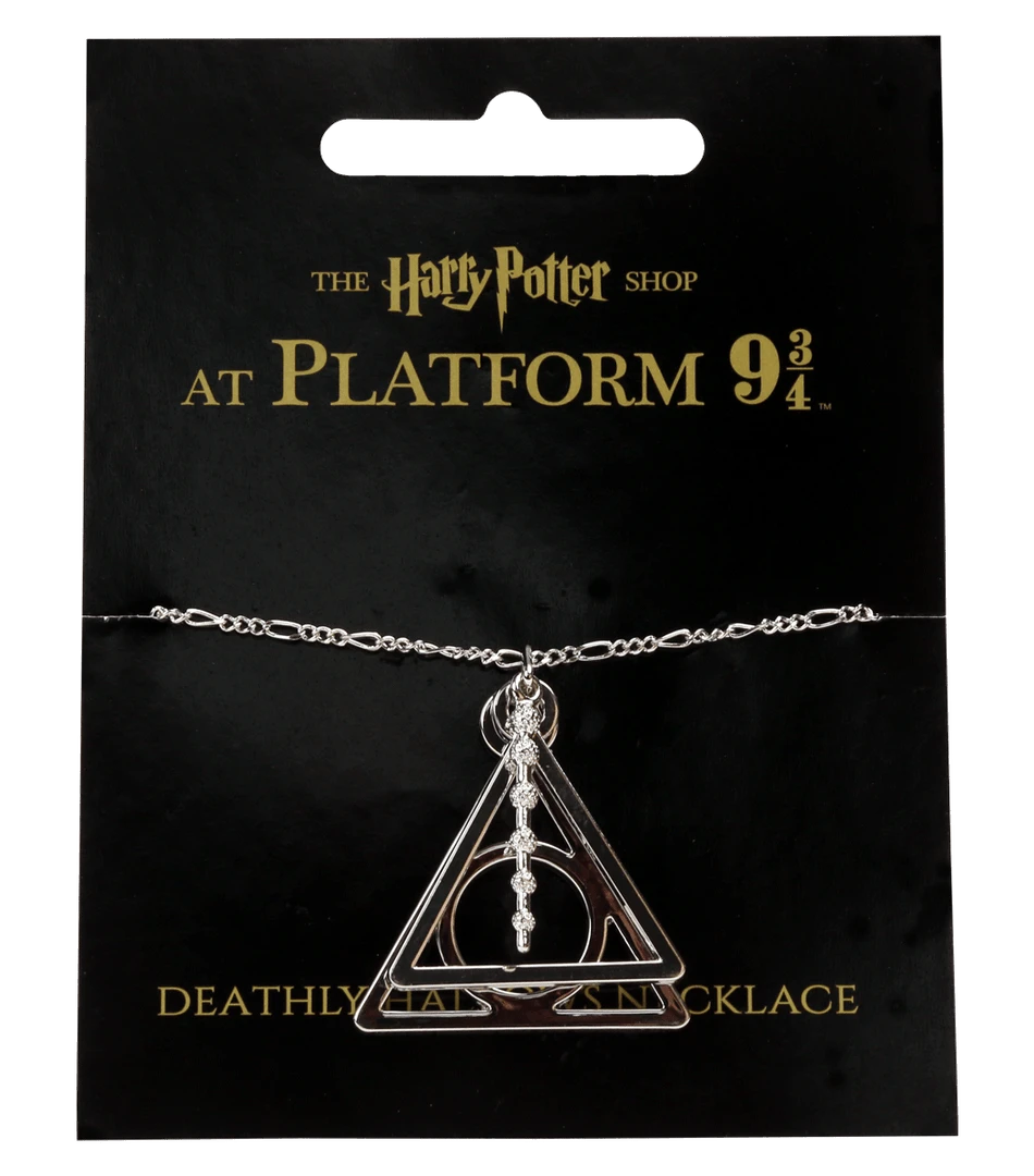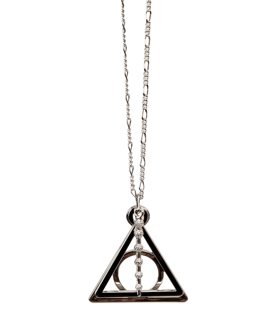 This triple-layered Deathly Hallows necklace encompasses all three symbols of the Deathly Hallows; the resurrection stone, the cloak of invisibility and a tiny replica of the Elder wand hanging in the centre. Each symbol is featured as a charm. Xenophilous Lovegood can be seen wearing a similar necklace in Harry Potter and the Deathly Hallows.