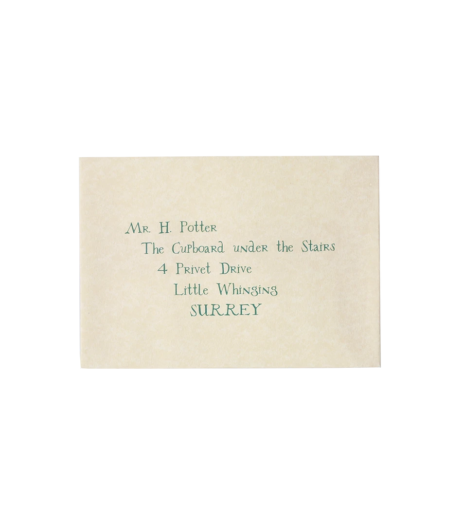A prop replica of Harry Potter’s Hogwarts acceptance letter. Harry receives his Hogwarts letter during Harry Potter and the Philosopher’s Stone. Contains Hogwarts acceptance letter, envelope, and wax seal.