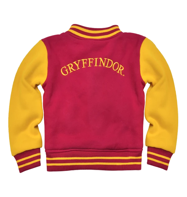 This Gryffindor toddler bomber jacket features yellow sleeves, an applique Gryffindor icon patch on the front, and house name across the back.