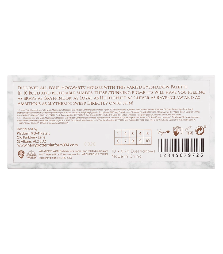 Create infinite eye looks taking you from daytime to night-time with the metallic and matte textured shadows. The Hogwarts Eyeshadow Palette is complete with white and grey marble effect packaging and includes a mirror on the inside of the palette. House Eyeshadow Palette is vegan and cruelty-free. Keep away from heat.