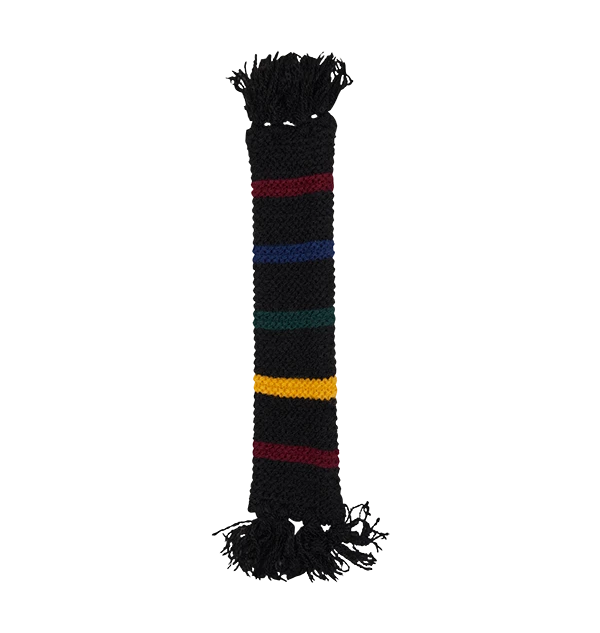 This woven Hogwarts scarf bookmark, featuring stripes of all of the iconic house colours against the black, measures at approximately 22cm x 4cm and is complete with black fluffy tassels at either end of the miniature scarf.