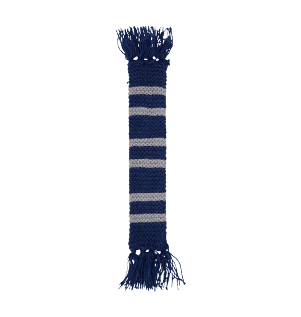 This woven Ravenclaw scarf bookmark, featuring traditional house colours in navy blue and silver, measures approximately 22cm x 4cm and is complete with blue fluffy tassels at either end of the miniature scarf.