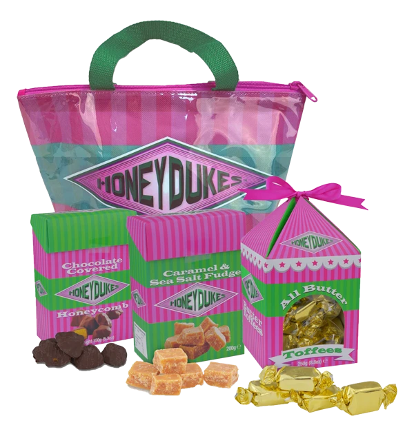 Our Honeydukes gift set contains some of your favorites with a reusable, dual-layer lunch bag. Delicious chocolate covered honeycomb, caramel and sea salt fudge, and all butter toffees come in Honeydukes branded boxes. Perfect for Wizards and Muggles with a sweet tooth.Â