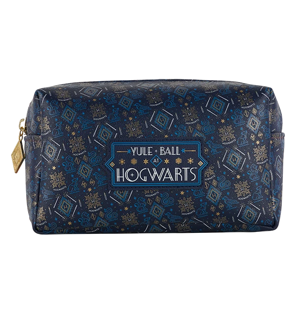 Seasonal magic can be found in this classy two-toned cosmetics bag from the Yule Ball cosmetics collection. An exclusive Hogwarts snowflake pattern in navy, plum purple, and gold is featured in alternate colours on each side of the bag. A metallic gold hardware zip with graphic Hogwarts pull tab will keep everything stored safely inside.